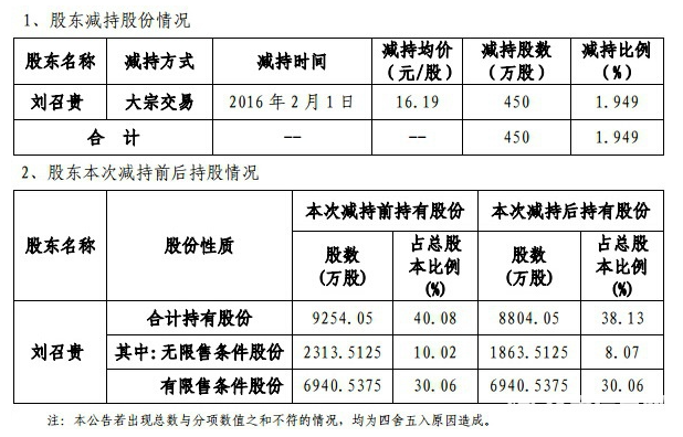 天瑞仪器2月1日晚间公告,公司控股股东、实际控制人刘召贵2月1日通过深圳证券交易所大宗交易系统减持公司股份450万股,占公司总股本的1.949%,减持均价16.19元/股。交易对象为天瑞仪器第一期员工持股计划。减持后,刘召贵持有公司股份38.13%。