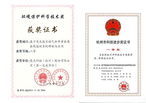 2015年12月,由聚光科技(杭州)股份有限公司牵头,中国环境监测总站和浙江大学参与的《基于荧光技术的气体中重金属在线监测系统研制与应用》分别获得了国家环境保护科学技术奖二等奖及杭州市科技进步奖一等奖。该项目研制的基于荧光技术的气体中重金属在线监测系统实现了对气体中重金属污染物(大气/烟气颗粒物中重金属及烟气中气态汞)的在线监测,弥补了常规离线方法(手工采样后送入实验室进行分析)的不足,满足了人们日益增长的对气体中重金属污染物浓度和变化趋势实时感知的需求。经专家鉴定,该项目研制的基于荧光技术的气体中重金属在线监测系统达到国际先进水平,打破了国外产品在我国的垄断局面,填补了国内该领域空白,提升了我国环境监测技术水平。