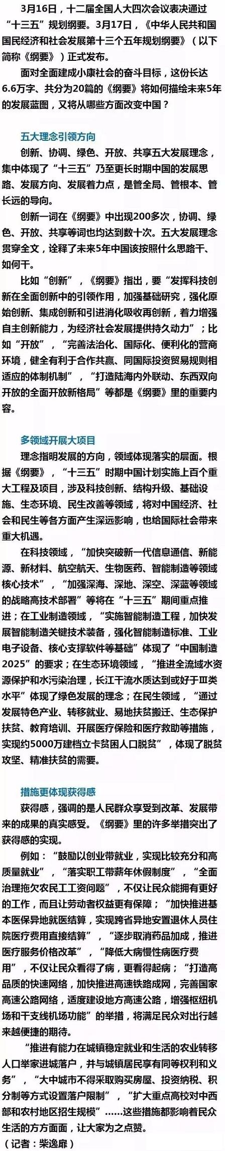 政策动向:“十三五”规划纲要公布 未来五年将这样改