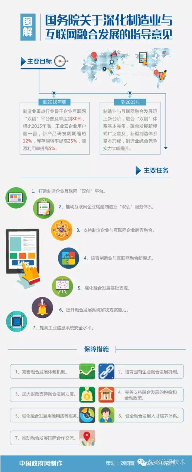 《意见》提出了完善体制机制、深化国有企业改革、加大财政支持力度、完善税收和金融政策、强化用地用房等服务、健全人才培养体系、推动国际合作交流等7个方面的政策支撑和保障措施。要求各地区、各部门高度重视深化制造业与互联网融合发展工作,统一思想,提高认识,加大工作力度,切实抓好政策落实。
