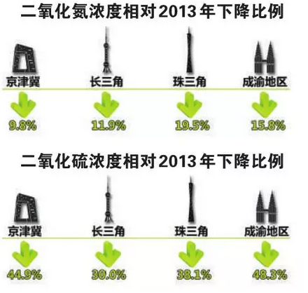 (一)《大气十条》实施以来,全国城市空气质量总体改善,PM2.5、PM10、二氧化氮(NO2)、二氧化硫(SO2)和一氧化碳(CO)年均浓度和超标率均逐年下降,大多数城市重污染天数减少。