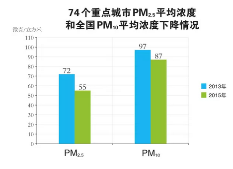 2015年,全国74个重点城市PM2.5平均浓度为55微克/立方米,相对于2013年的72微克/立方米下降23.6%;日均值超标天数的比例由2013年的33.2%降至2015年的20.8%。全国PM10平均浓度(338个城市平均浓度为87微克/立方米),相对2013年(330个城市平均浓度97微克/立方米)下降10.3%;日均值超标天数的比例由2013年的14.5%降至2015年的12.1%。74个重点城市共发生846天次重度污染和238天次严重污染,较2014和2013年降幅分别为28.1%、24.9%以及49.9%、63.7%。京津冀、长三角、珠三角和成渝地区NO2浓度相对2013年分别下降9.8%、11.9%、19.5%和15.8%,SO2分别下降44.9%、30.0%、38.1%和48.3%。卫星资料反演显示,2013~2015年,全国NO2和SO2垂直柱浓度年均值和颗粒物光学厚度(AOD)总体呈下降趋势,与地面监测数据分析结果一致。
