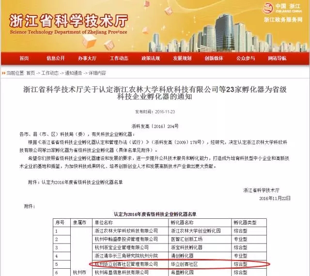 11月22日,浙江省科技厅网站发布消息:认定23家孵化器为2016年度浙江省级孵化器。华立创客社区忝列其中。
