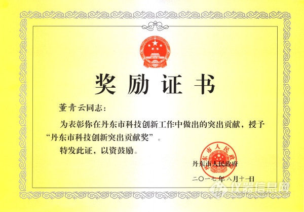 2017年8月22日丹东市召开全市科技创新大会,会上宣读了表彰决定。丹东百特仪器有限公司获得“丹东市十佳高新技术企业”称号,总经理董青云获得“丹东市科技创新突出贡献奖”,基准法环境空气颗粒物PM2.5和PM10自动监测仪项目获“丹东市科技进步一等奖”,成为本次科技创新大会唯一获得三项大奖的企业。