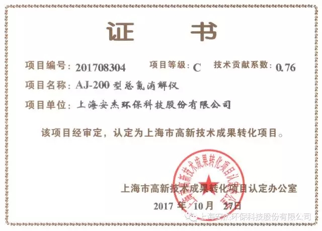 2017年10月,安杰科技喜获由上海市高新技术成果转化项目认定办公室颁发的关于“AJ-200型总氮消解仪”的认证证书,这是继2016年5月我司“气相分子吸收光谱仪AJ3000”获得认证后的又一项高新技术成果获得认定。