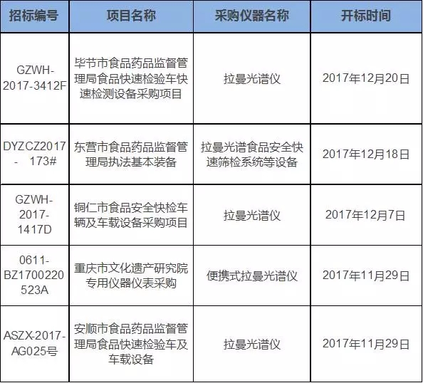 根据中国政府采购网中标信息不完全统计(以“拉曼”为关键词的中标搜索结果),截至目前(2017年11月28日),今年已经有数十个项目的中标信息中涉及到便携/手持拉曼光谱仪的采购。