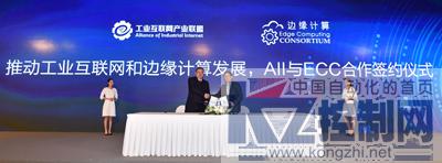 边缘计算产业联盟(ECC)理事长于海斌(左)与工业互联网产业联盟(AII)秘书长余晓晖(右)签署战略合作协议