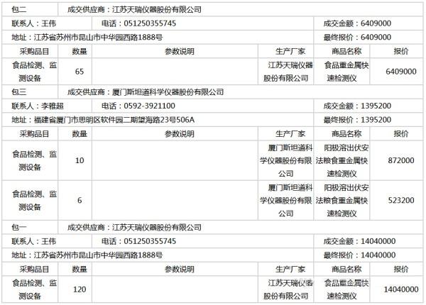 项目 公开招标中标公告显示,天瑞仪器的X射线荧光光谱法粮食重金属快速检测仪(手动进样)中标65台,X射线荧光光谱法粮食重金属快速检测仪(自动进样)中标120台。总计185台价值2044.9万元。除过16台阳极溶出伏安法粮食重金属快速检测仪,天瑞仪器几乎包揽了这批湖南省粮食局的招标采购。