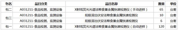 湖南省粮食局 粮食重金属快速检测设备(第二批)采购预算为2760万元,分为三包,采购明细如下表所示。