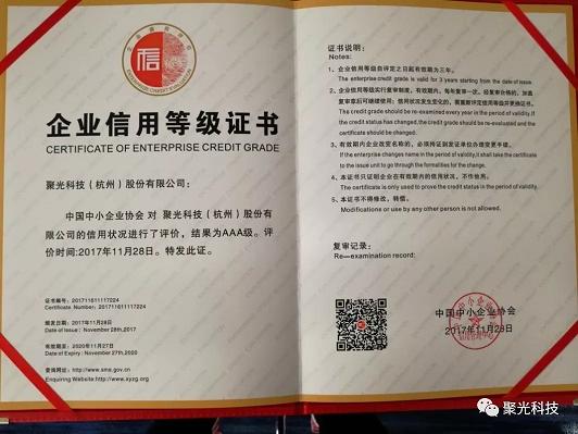 2018年1月12日,国家商务信用企业授牌仪式在杭州召开,聚光科技(杭州)股份有限公司荣获“企业信用评价AAA级信用企业”的荣誉。授牌仪式由中华人民共和国国家发展和改革委员会(以下简称国家发改委)筹建的中国中小企业协会举办。