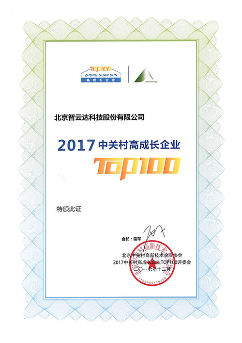 在北京市科委、中关村管委会、海淀园管委会的指导与支持下,由北京中关村高新技术企业协会主办“2017中关村高成长企业T0P100”评选活动,北京智云达科技股份有限公司顺利通过评审,成为2017中关村高成长企业TOP100评选上榜企业。
