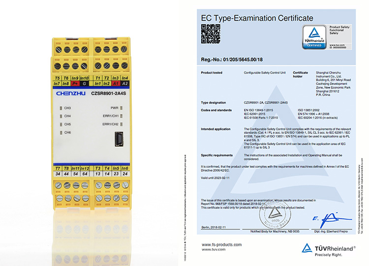 此次发布的CZSR8900系列智能安全继电器产品是辰竹自主研发制造的新产品,达到IEC 61508 SIL3, EN/ISO 13849 PLe /Cat.4, IEC/EN 62061 SIL3等级,是国内同类产品中第一家获得德国莱茵TüV颁发的欧盟机械指令认证证书、功能安全认证证书的可组态安全控制模块产品,可靠性高;具有单、双通道操作,支持自动、手动复位,功能全面。