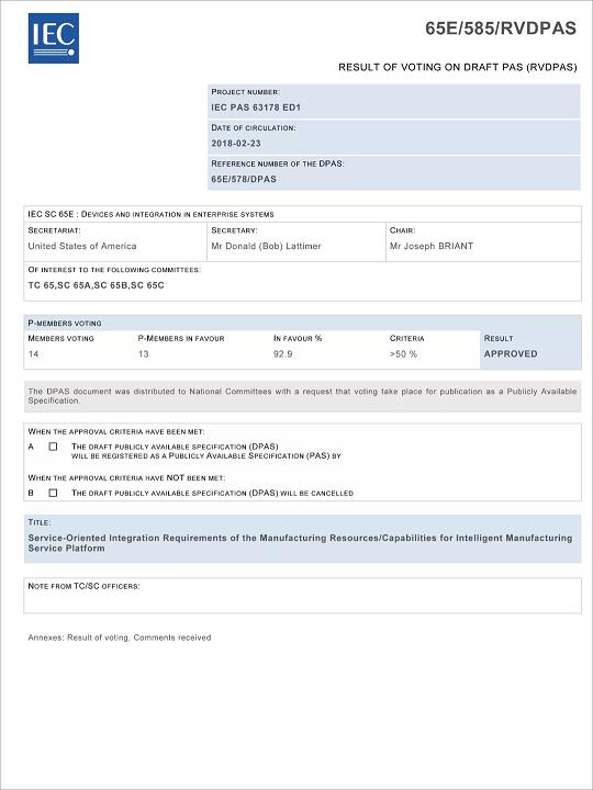 经国际电工委员会工业过程测量控制与自动化技术委员会(IEC/TC65)投票,由中国提出的《智能制造服务平台制造资源接入集成要求》标准提案,以92.9%的通过率成为国际上首个面向智能制造服务平台的资源接入集成规范标准,即IEC PAS 63178:Service-Oriented Integration Requirements of the Manufacturing Resources/Capabilities for Intelligent Manufacturing Service Platform。