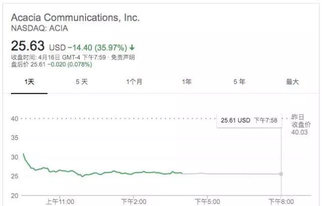 当日,通讯元器件制造商Acacia通信股价暴跌35.97%;电信和数通市场光器件、模块和子系统供应商Oclaro股价下跌15.2%;光纤产品生产和销售商Lumentum Holding股价下跌9.1%。