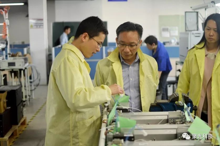 梁主任和邓主任一行首先参观了公司展厅和大气产品生产线,聚光科技大气分析产品线总监黄伟详细介绍了公司的发展历程、业务领域及设备生产情况。参观生产线和实验室时,梁主任和邓主任对聚光科技大气AQMS-3000微型环境空气监测系统、PFS-100光解光谱仪和车载TOF-MS VOCs分析系统等产品表现出了浓厚的兴趣。