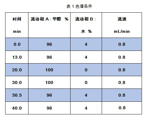 液相色谱采用二元高压梯度洗脱方式。色谱柱采用Athena C18柱,4.6×250mm,粒径5μm;流速:0.8mL/min;波长:294nm;进样量:20μL。梯度洗脱如表1所示