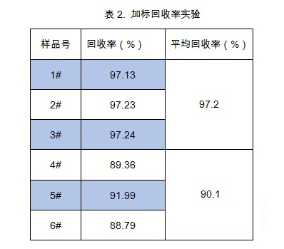 选取杏仁作为基质样品,根据样品制备和萃取条件,并加入一定量的α-VE标准溶液,考察α-维生素E的加标回收情况,回收率见表2。