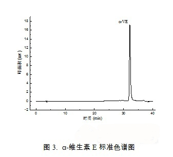 在表1的色谱条件下,对配制不同标准系列溶液进行分析,从低浓度到高浓度进样,在2-100μg/mL的条件下,得出标准曲线方程为Y=11037.30645X+4764.28303,相关系数r =0.9999,标准曲线如图4所示,α-VE的质量浓度与其峰面积线性关系良好。α-VE标样(40μg /mL)的高效液相色谱图见图3。以3倍信噪比确定最低检出限,检出限为0.04μg/mL。