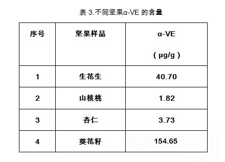 根据上述方法对市购的四种坚果中α-VE的含量进行测定,结果如表3所示。其中葵花籽的含量最高,达到154.65μg/g。