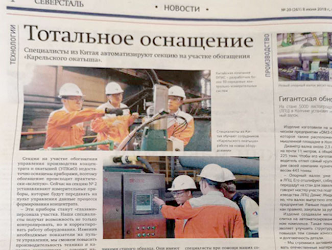2018年6月19日,从俄罗斯传来消息,俄第三大钢铁集团北方钢铁集团以“工艺设备全面升级”为题,对该集团下辖的卡列里斯克矿业公司应用来自中国东方测控公司的高端在线检测仪器的情况进行了专题报道。俄业主对东方测控产品予以肯定。