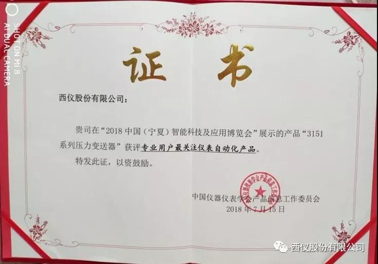 近日,西仪股份有限公司“3151系列压力变送器”在2018中国(宁夏)智能科技及应用博览会上获得“专业用户最关注仪表自动化产品”称号。