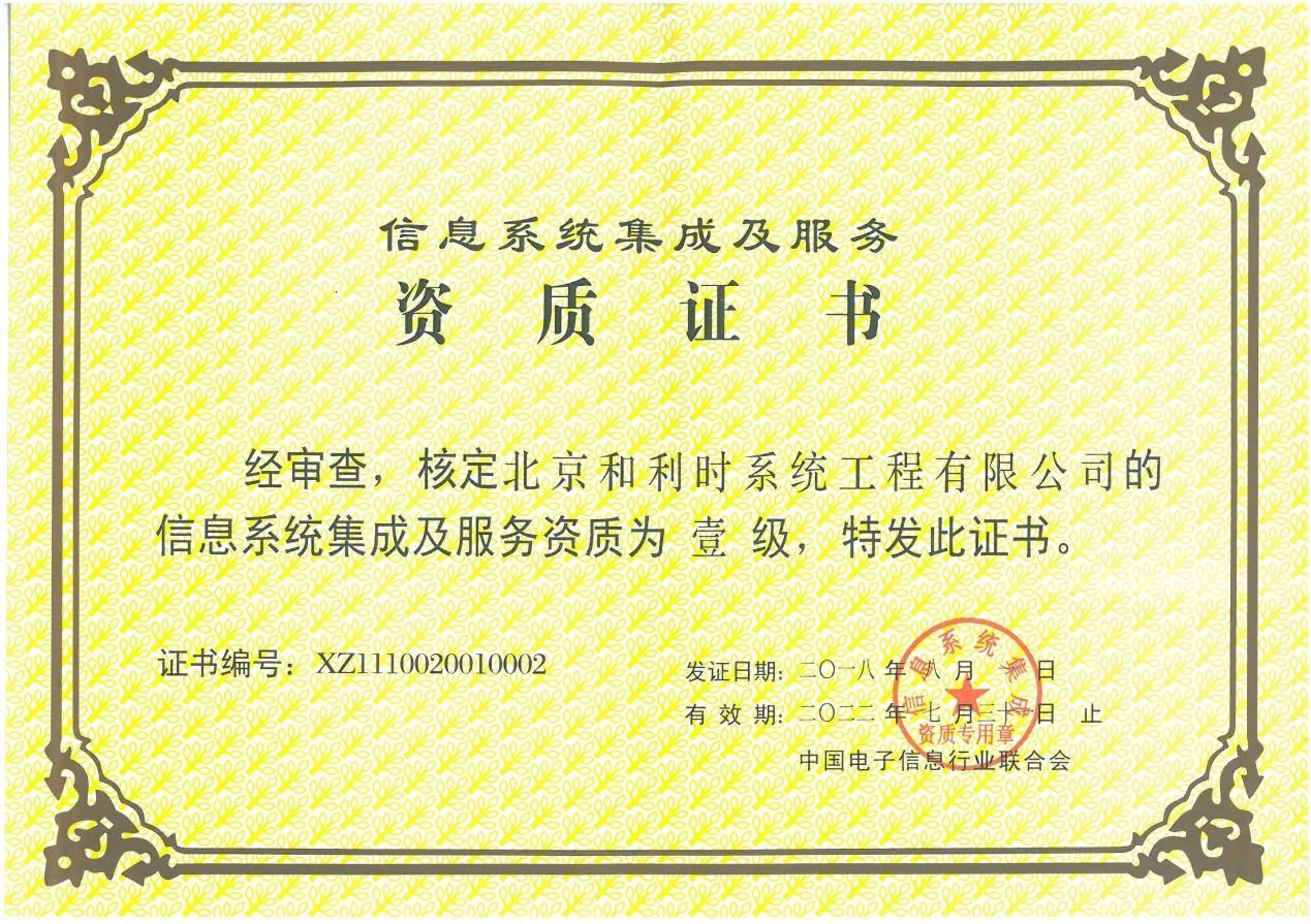 2018年8月1日,在北和公司技术质量部、国铁自动化事业部、地铁自动化事业部、设计中心、经营管理部、计划财务部等部门的共同努力下,和利时顺利通过了信息系统集成及服务一级资质认定。工业和信息化部主管的中国电子信息行业联合会为和利时颁发了新版信息系统集成及服务一级资质证书。这是国内信息系统集成及服务领域的最高等级资质,标志着和利时在研发、集成、服务和管理能力等方面均已达到了国内领先水平。