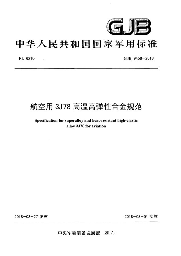 2018年8月1日,由中央军委装备发展部颁布的国家军用标准《航空用3J78高温高弹性合金规范》正式实施。该标准是以重庆材料研究院为主编单位,联合抚顺特殊钢股份有限公司、北京航空材料研究院、沈阳黎明航空发动机(集团)有限责任公司、海军驻洛阳地区航空军事代表室、冶金工业信息标准研究院等单位共同编制的。重庆材料研究院特种合金部万红担任编制组组长。