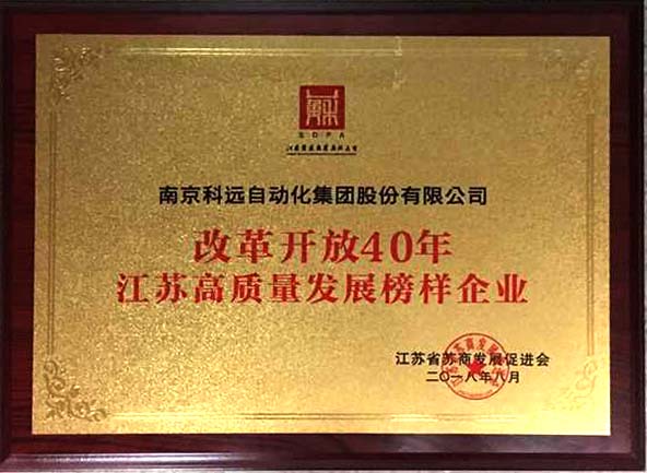 2018年8月8日,由江苏省苏商发展促进会主办的“改革先锋•荣耀苏商——改革开放40年40人(企)”颁奖典礼在南京举行。科远股份荣获“改革开放40年•江苏高质量发展榜样企业”称号。