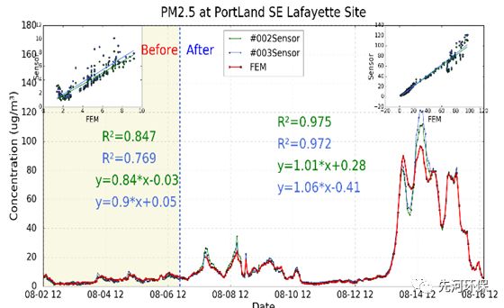 下图为细粒子(PM2.5)传感器(蓝色和绿色)与美国国控点数据(红线)的对比图