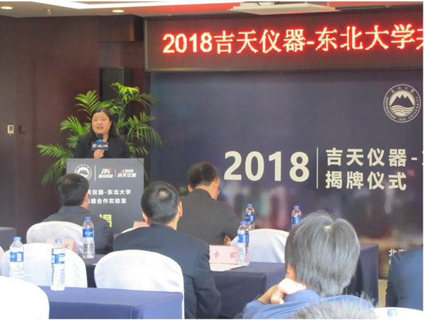 随后,北京吉天仪器有限公司董事长彭华女士上台致辞,为大家介绍了吉天公司历史以及未来战略发展规划。她提到:吉天仪器是我国具有强大影响力的专业从事实验室分析仪器研发、制造、销售的高科技企业,同时也是国内实验室分析领域产品覆盖面广、极具规模的实验室业务供应平台之一。东北大学有着雄厚的科研实力,在以科技力量推动东北经济及全国经济发展上面的作用是有目共睹的。彭华女士表示共建合作实验室的成立,有助于双方科研研究的开展、检测方法的开发,并就双方在人才交流及相关学科建设等方面开展合作表达了深切的愿景。