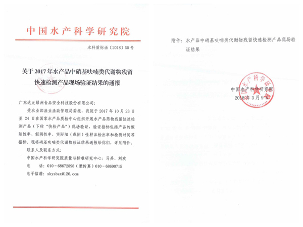值得一提的是,此前,在2017年水产品中硝基呋喃类代谢物残留快速检测产品验证中,食安科技生产的硝基呋喃代谢物快速检测盒等4种快检产品也全部通过验证。