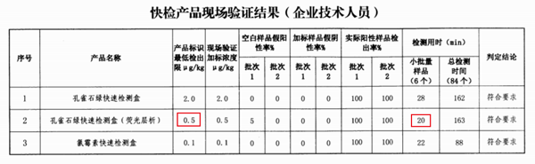食安科技参与本次验证的产品有孔雀石绿快速检测盒、孔雀石绿快速检测盒(荧光层析)以及氯霉素快速检测盒。现场验证期间,技术人员使用2个批号快检产品现场检测84个鱼糜样品,评判结果表示食安科技验证的产品全部符合评价标准要求!值得注意的是,孔雀石绿快速检测盒(荧光层析)产品标识最低检出限为0.5μg/kg,检测用时仅为20min,具备高效高灵敏度的特点,为全场检出限度最低用时最短的产品!