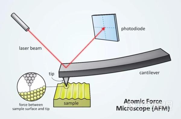 原子力显微镜的基本架构图,主体结构为一个微悬臂梁,悬臂梁的自由端设有一探针。探针尖端的曲率半径约数个纳米,它与试体间存在分子间作用力。以低功率激光照射在探针背面,其反射讯号投影在光感测器,藉由光感测器上光点的位置探知微悬臂梁的振动情况。