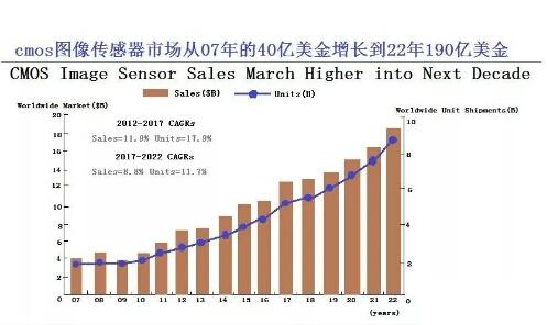 根据2017年公开报告数据显示,2017年全球CMOS图像传感器销售额为125亿美元,同比增长19%;预计2018年将达到137亿美元,同比增长10%。预计2017-2022年出货量CAGR达11.7%,销售额的CAGR为8.8%。至2022年,CMOS传感器的全球销售额将达到190亿美金。