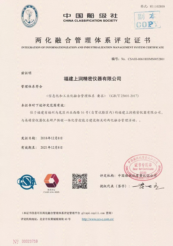 2018年12月8日,福建上润精密仪器有限公司成功通过两化融合管理体系贯标评定,获得由中国船级社颁发《两化融合管理体系评定证书》,成为符合 GB/T23001-2017 标准的国家级两化融合管理体系贯标企业。