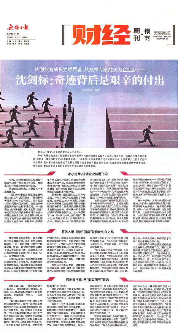2018年12月28日,《无锡日报》财经周刊记者采访了沈总。在一个多小时的采访中,沈总介绍了公司的发展历程、创业的艰辛,分析了改革开放的大潮对企业生存发展的影响、危机和机会,感悟到了企业从“活下去”到“稳成长”必须练内功、强管理,非常清晰地指出企业升级或转型发展必须走适合自己的“机器化-自动化-数字化”的道路。