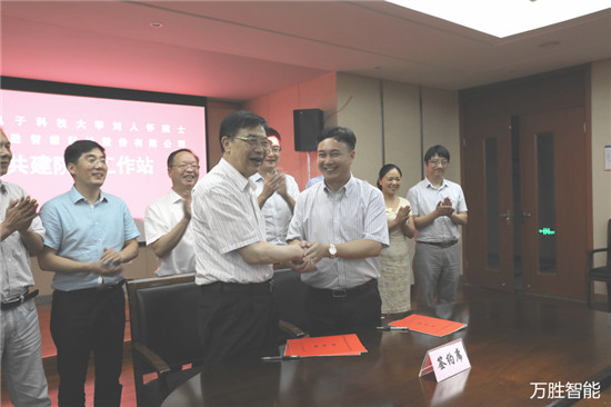 杭州电子科技大学刘人怀院士在天台乡贤、杭州电子科技大学校长朱泽飞的牵线下,与浙江万胜智能科技股份有限公司签订了共建院士工作站协议。