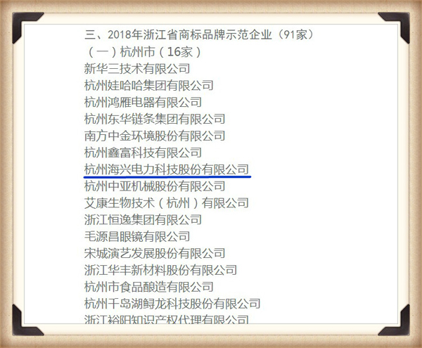近日从浙江省市场监督管理局(原省工商局)传来喜讯,海兴电力荣获了2018年“浙江省商标品牌示范企业”荣誉称号,获此殊荣的杭州企业仅有16家。