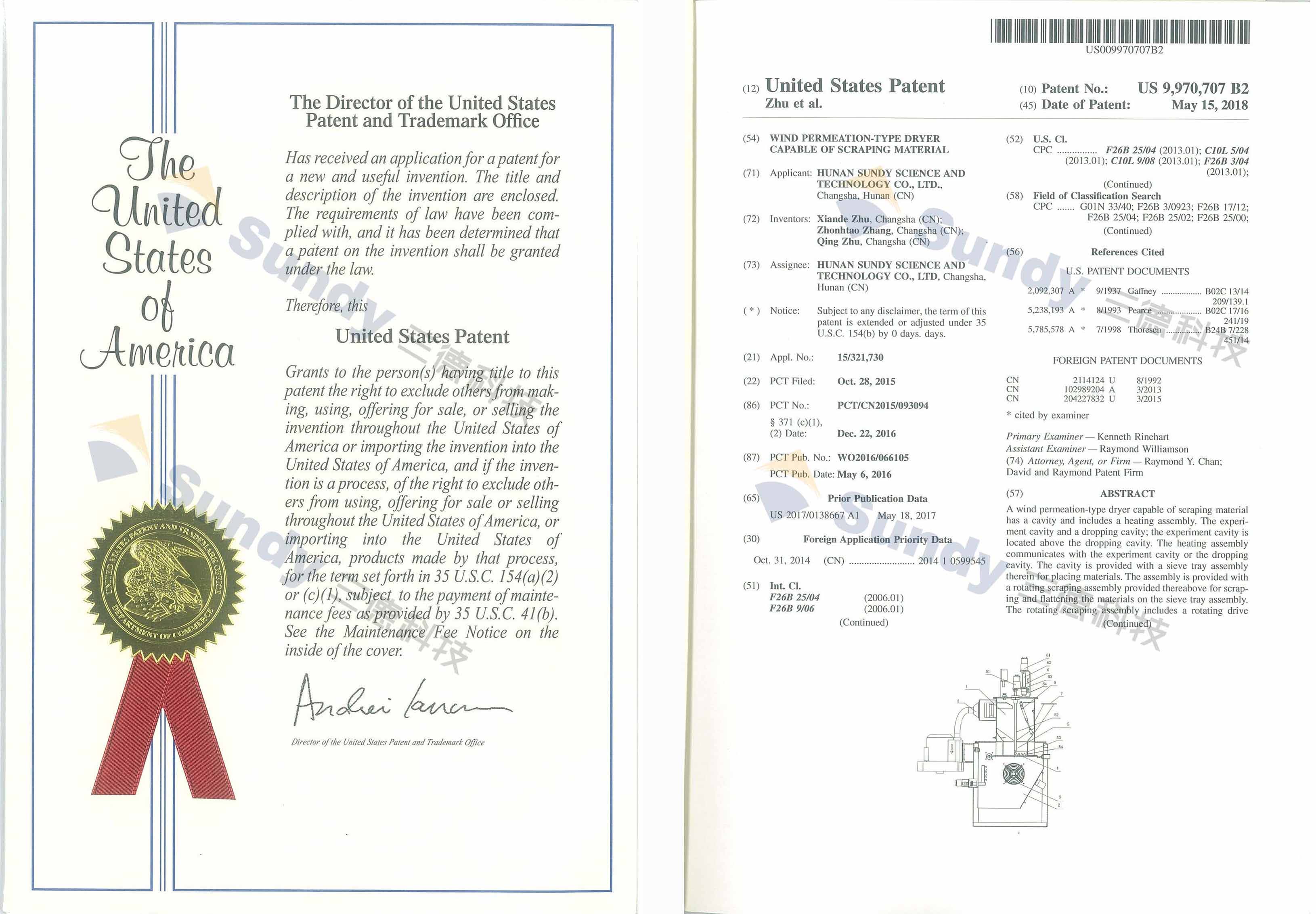 近期,三德科技收到USPTO(美国专利商标局)颁发的专利授权证书(公告号:US 9,970,707 B2),意味着公司提交的专利名称为“可刮扫物料的风透式干燥设备”的风透®在线干燥技术通过美国发明专利审查。这是风透®干燥技术继获得澳大利亚、俄罗斯、南非、印尼、土耳其、蒙古等国专利授权后,再次获得海外授权专利,亦是公司首次获得美国专利授权。