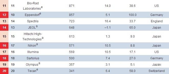 Eppendorf是一家德国私人公司,开发和销售用于处理实验室液体、细胞和样品的仪器,以及消耗品和服务。其产品包括自动移液系统、离心机、混合器、光谱仪、DNA扩增设备、发酵罐、生物反应器和细胞操作系统。 然而,Eppendorf并未公布其仪器销售,因此C&EN的排名基于总销售额。这些销售额是根据2018年中期的公司预测估算的,当时它表示2018年的销售额将“以中等数字”增长。