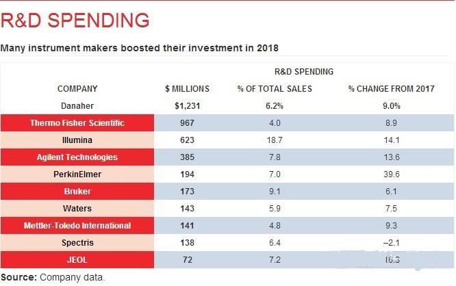 Illumina的仪器销售额占其收入的近17%,在2018年增长了10%以上。该公司销售的大多数仪器用于新一代测序,但约7%是微阵列。该公司的客户包括基因组研究中心、学术机构、政府实验室、制药和生物技术公司,以及23andMe等血液研究公司。作为基因测序市场的领导者,Illumina在2018年11月以12亿美元的协议价格收购了其竞争对手Pacific Biosciences,该交易将使PacBio的长读序列技术成为Illumina的短读功能。今年早些时候,Illumina收购了Edico Genome,这是一家用于下一代测序的数据分析工具供应商。在C&EN跟踪的仪器制造商中,Illumina在研发方面的投入比例最高,接近19%。