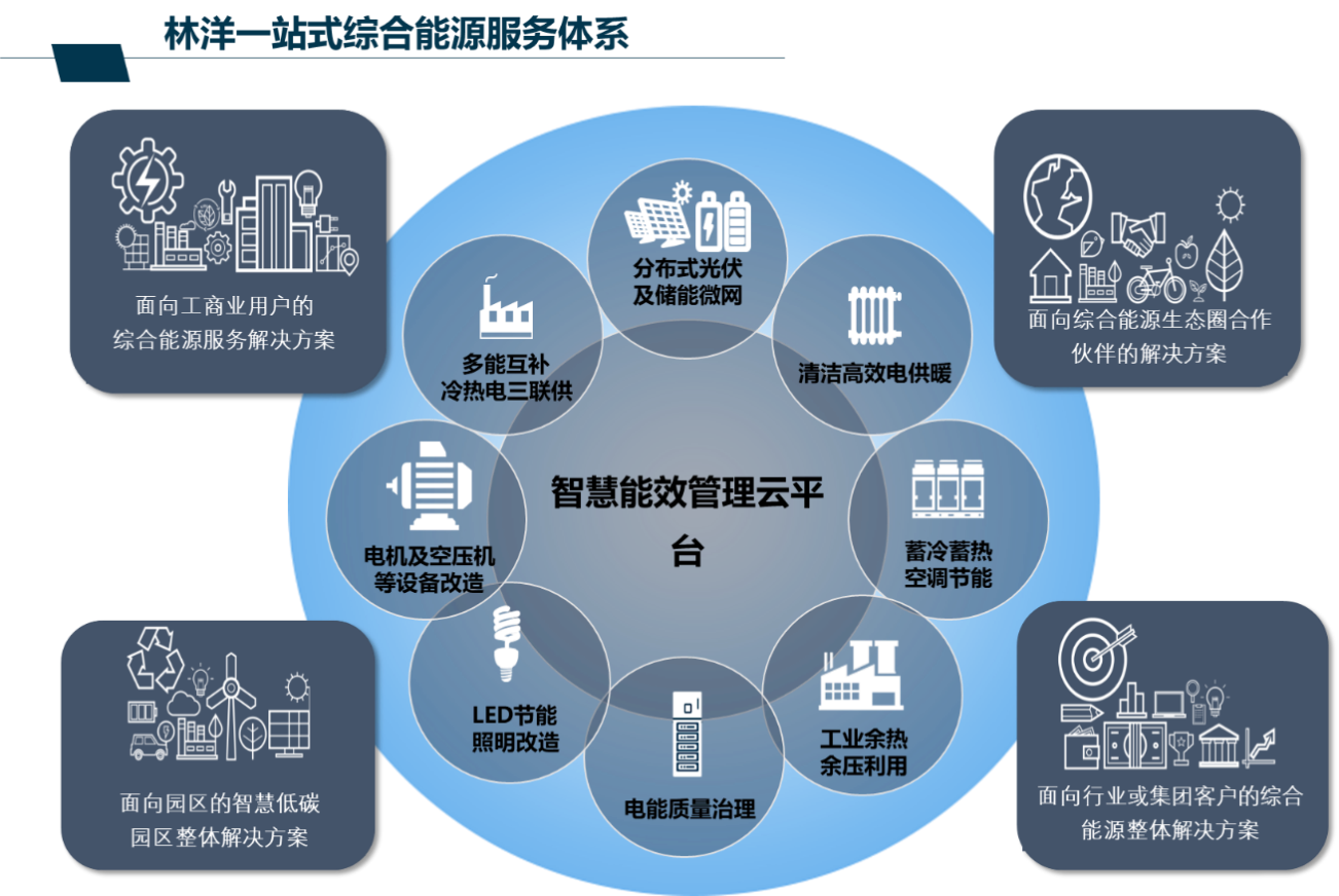 林洋能源植根于电力行业20余年,现已成为全球电能计量及用电信息管理领域的领先企业之一,基于长期以来对行业背景和政策趋势的深度研判,公司在2017年整合资源成立智慧能源事业部,发力综合能源服务领域。主要面向工业园区、行业用户、业内合作伙伴等领域,提供综合能源服务一体化解决方案,针对客户的用能特点、场地情况、投资意愿等各方面因素,为客户提供针对性的解决方案,从而通过提高用户能效管理水平降低用户的用能成本。