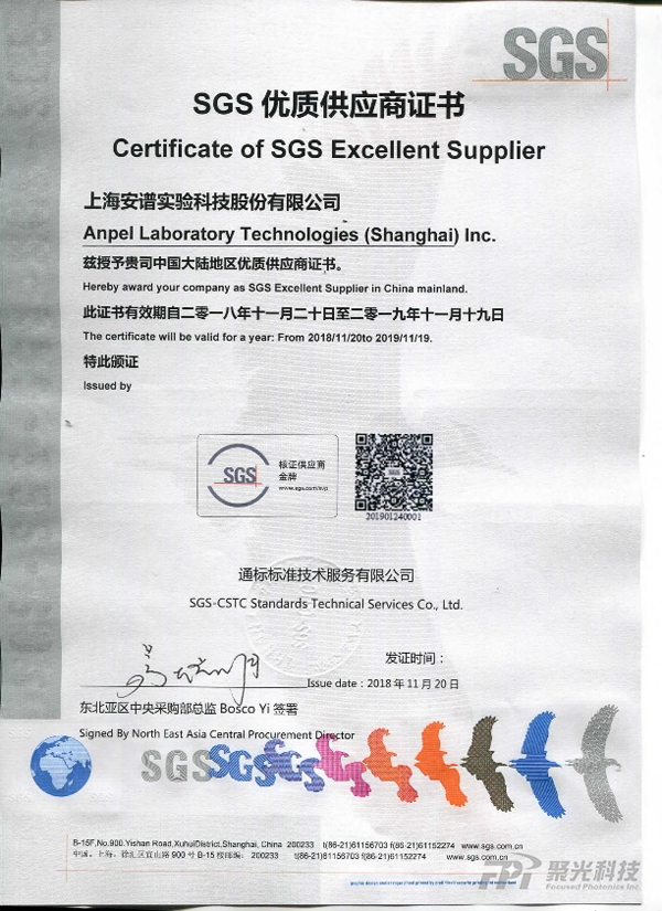 聚光科技(杭州)股份有限公司(以下简称“聚光科技”)下属子公司上海安谱实验科技股份有限公司(以下简称“安谱实验”)又获得SGS优质供应商证书了!