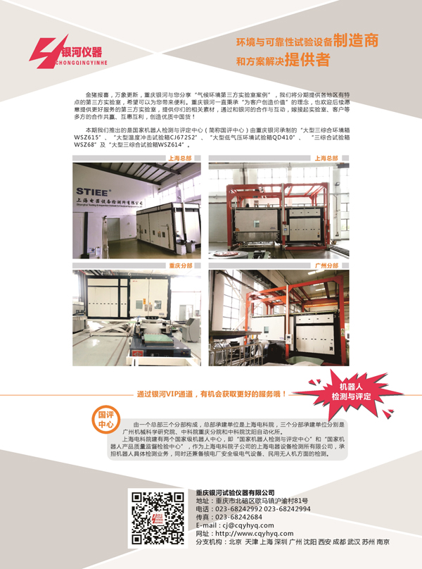 重庆银河承制国家机器人检测与评定中心(简称国评中心)的“大型三综合环境箱WSZ615”、“大型温度冲击试验箱CJ672S2”、“大型低气压环境试验箱QD410”、 “三综合试验箱WSZ68”及“大型三综合试验箱WSZ614”。