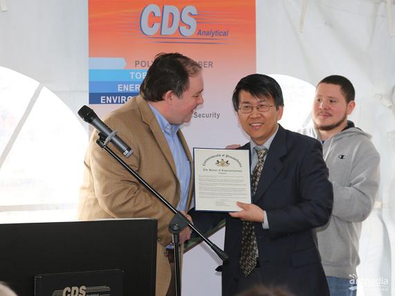 (左:美宾夕法尼亚州众议员约翰·劳伦斯,中:CDS总经理王淼博士,右:CDS员工代表嘉实华·惴史可)