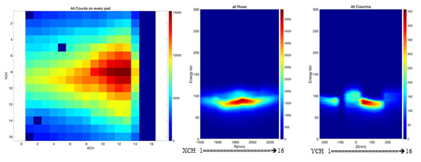 GEM相机通量分布(左),R向能谱分布(中),Z向能谱分布(右)