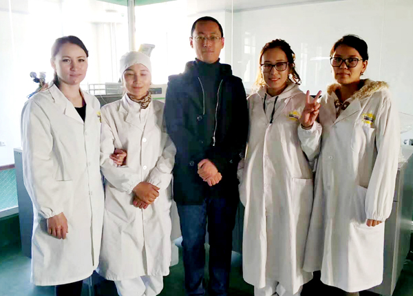 海光工程师徐明与哈萨克斯坦金骆驼公司检测人员在仪器前合影