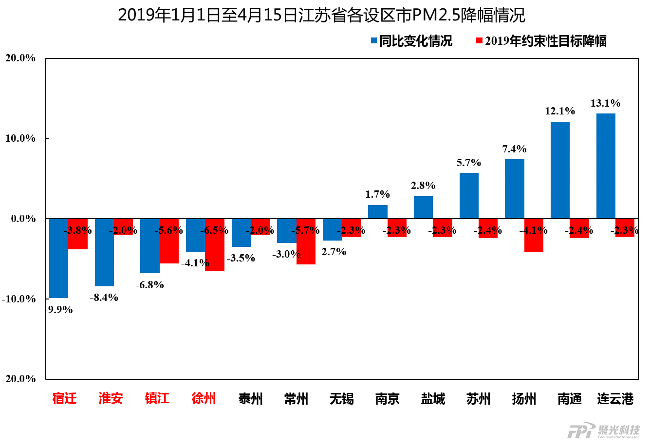 江苏省通报了13个设区市2019年度1月1日至4月15日环境空气质量情况,由聚光科技(杭州)股份有限公司下属子公司无锡中科光电技术有限公司(以下简称“中科光电”)提供空气质量保障绩效服务的宿迁市、淮安市、镇江市1月1日至4月15日的PM2.5同比下降率包揽了江苏省前三名,宿迁、淮安跻身“双达标”城市。至此,全省“双达标”城市增加到4个。此外,中科光电也助力常州、徐州有效降低了PM2.5浓度值。