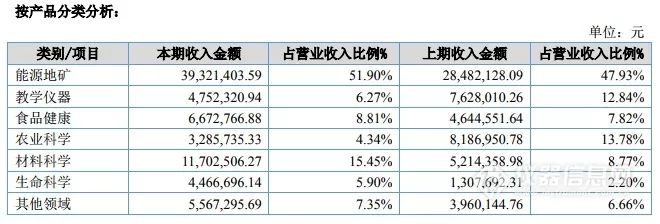 依据其主要销售领域的不同,可以分为能源地矿、材料科学、食品健康、农业、教学等几大类,其中能源地矿 3,932.14 万元、材料科学 1,170.25 万元、食品健康领域实现 667.28 万元,教学仪器为 475.23 万元、生命科学 446.67 万元、农业科学为 328.57 万元、其他领域合计共 556.73 万元。在宏观经济整体放缓的经济形势下,公司在报告期内仍然实现销售收入的快速稳定增长。