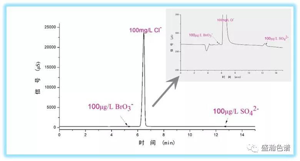 自动量程电导检测器,根据样品的不同浓度自动调整信号值的大小, 100ppm氯离子直接进样,也不会出现平头峰(超量程)。